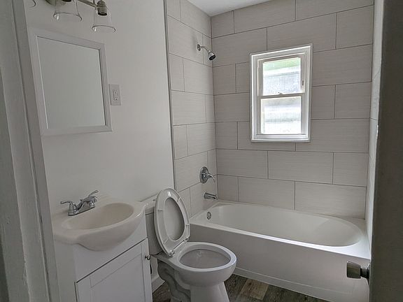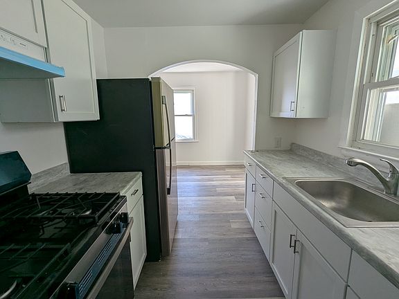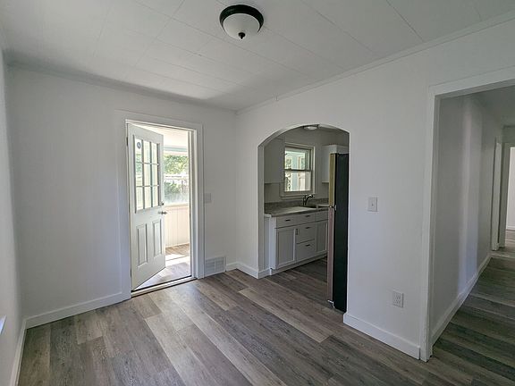 All new kitchen and bathroom. Generous enclosed rear porch for watching over a barbecue. Single car garage and large driveway. Two bedrooms, dining room, and large living room on the first floor. Bedroom and bonus room / office on the second floor. Full unfinished basement with washer and dryer hookups and utility tub.