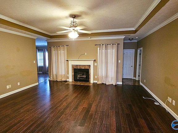 Experience the charm of this 3-bedroom,2-bath brick haven in an enviable location near Hartselle schools and shopping. This inviting home boasts a spacious family room highlighted by stunning trey ceilings, crown molding, and a cozy gas fireplace as captured in the images. The sleek kitchen features an island, ample cabinets, and tile backsplash. Retreat to the main suite's glamour bath complete with a soaking tub and double vanity. All bedrooms offer walk-in closets. Outdoor delight awaits with a serene backyard showcasing a large patio, inviting above-ground pool with a deck, and an outbuilding, all enclosed by a privacy fence. Proximity to the interstate ensures swift access to Huntsville