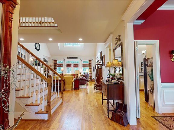 Welcome to a full-brick & stone home on over an acre in Bridgewater! Primary Bedroom on Main! This home has stately architectural finishes including impressive arches, crown moldings, special ceiling & oversized window features, built-ins, tile, and hardwood floors. The primary suite & bathroom features a tray ceiling, dual vanities, a Jacuzzi tub, a separate shower & walk-in closet. The main level also features a family room w 2nd story window, cozy gas fireplace, kitchen breakfast area with wooden barrel ceiling, breakfast bar, s/steel, dining rm w/chaurffered ceiling, & laundry rm with cabinets/sink. The upstairs feature 2 secondary bedrooms plus a bonus room adjacent to the bathroom/closets. Walk-in attic & space for storage. Natural light floods into all the large oversized windows & French doors leading onto a deck and patio complete with a remote-controlled awning overseeing a peaceful, natural backyard oasis. Supplemental heat in the garage. Roof (2020) HVAC (2020/2021).