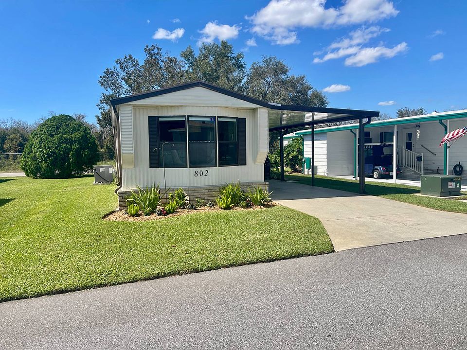 Whether you are looking to purchase a Florida home for a full time residence or vacation place, this immaculate home has it all and comes fully furnished! This lovely decorated updated home is a perfect place to experience all that Florida has to offer. Updates include new architectural shingle roof in 2023 with a transferable warranty, new HVAC system in 2022, and the seller believes the previous owner added a new water heater in 2018. Vinyl flooring can be found in all areas except the bathrooms which has linoleum. The bathroom cabinets and toilets have also been replaced by the current owner. Currently, this home has 2 bedrooms with 1 and 1 half bathrooms. The half bathroom could easily be converted into a full bathroom by adding a shower. There is additional living space available for relaxing or entertaining in the oversized lanai area. Low lot rent of $554.31 monthly currently makes this home extremely affordable no matter what your needs. The laundry room is located conveniently inside the unit. There is a golf cart shed approximately 12 x 14 attached to the carport to provide you with lots of storage space. This beautiful home has a prime location within the gated 55+ community of Hidden Golf. The community is very active and sports an 18 hole golf course, shuffleboard, pickleball, and 2 swimming pools, etc. Call to schedule your showing today!
