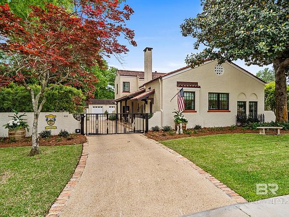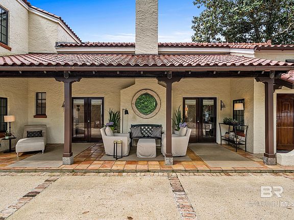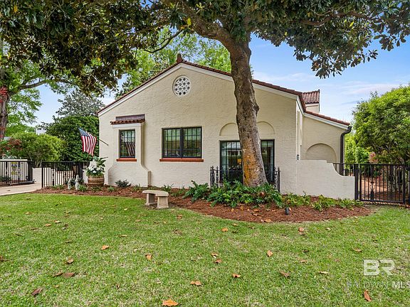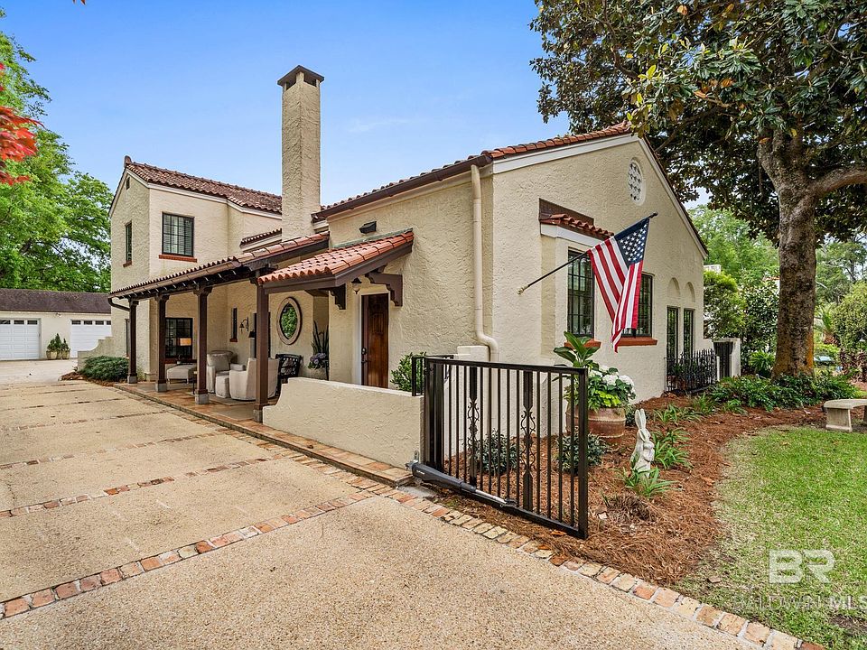Near downtown Fairhope, this beautifully updated Spanish Colonial home boasts a premier location and exquisite features. The property includes a fully renovated guest "casita," front and rear courtyards, lush landscaping for privacy. Upon entering, gleaming Saltillo tile floors guide you through the main level. The kitchen, master bath, and master closet have been meticulously restored. Designer white smooth stucco walls contrast elegantly with rich wood trim, mantle, and beams, creating a visually stunning interior. The open living area features a fireplace and high ceilings, flowing into a spacious dining room. A vintage built-in bar has been enhanced with handcrafted deep wood shelves and trim. The master bedroom and bath offer a peaceful retreat, conveniently located near a spacious study. The galley kitchen is equipped with gourmet appliances, quartz countertops, an oversized stainless steel apron sink, and a Thermador gas range with a pot filler. A cozy sitting room off the kitchen provides a tranquil space to unwind. Upstairs, an ornate iron balcony overlooks the dining room and leads to 2 bedrooms with a shared bath. The separate one-bedroom casita includes a private bath, kitchenette, and ample closet space, renovated in 2018 for ultimate comfort for overnight guests. Throughout the home, elegant arched doorways and windows complement the architectural beauty, while artful and colorful Mexican tiles add character. Square footage listed in tax records pertains solely to the main house, with an additional ~400 square feet for the detached casita. All information provided is deemed reliable but not guaranteed; buyers are advised to verify all measurements and Buyer to verify all information during due diligence.
