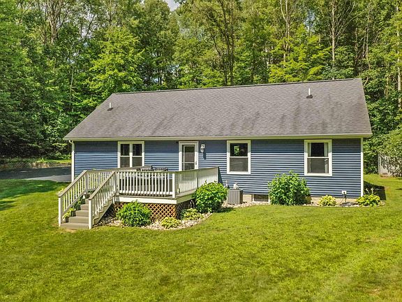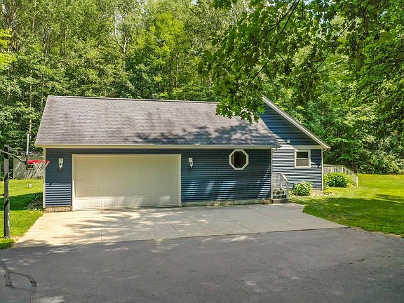 This Builders home is situated on 2 wooded acres and includes 4 bedrooms & 3 bathrooms. The master suite indulges with a walk-in closet and private bath w/ newly titled shower. Main level hosts 3 beds, 2 baths, and a skylit kitchen with barstool seating. The lower level presents a world of possibilities. One bedroom and bathroom provide a secluded retreat for guests. Additionally, a storage room keeps your belongings organized, while the recreational room/family room is a fantastic space for entertainment. The lower level also boasts two versatile rooms, perfectly suited for an office, crafting haven, or any other creative endeavor you desire. With its deck accessible from the living room and a charming front porch, this home allows you to relish in the tranquility of the outdoors, whether you're sipping your morning coffee or hosting a barbecue with friends and family. Besides the attached 2 car garage the property also features a spacious 25x64 pole barn (back half is fully insulated and front half was added in fall 2021). Recent upgrades include (2020: well, AC, water softener, siding; 2019: water heater).
