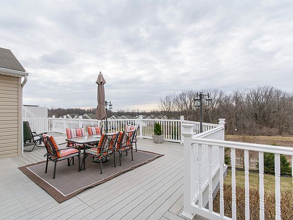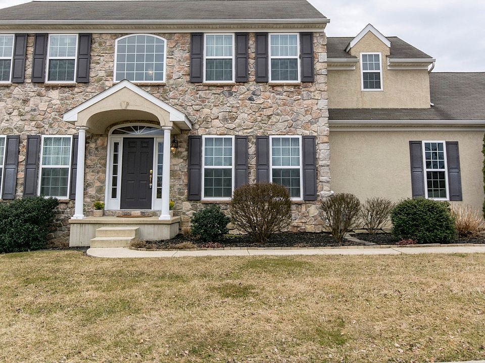 Greeted by picture-perfect curb appeal, 802 Edna Jane Lane offers beautifully manicured landscaping with lush hydrangeas and hardscaping as you walk up to the front portico backed by a stately stone facade. An inviting 2-story foyer flows into a modernized Colonial floor plan featuring over 3,300 sqft, 4 bedrooms, 2 full plus 2 half baths, and a fully finished lower level. The open living and family rooms open to each other and welcome you in, accented by a warm gas-burning fireplace with sleek slate surround, hardwood floors, and a seamless transition into the kitchen. The kitchen is spacious in size and the perfect place for hosting small to large gatherings. Equipped with a stainless steel appliance suite including an electric range, double stainless sink, a large center island that comfortably seats 3, tons of cabinetry and sits between a gorgeous formal dining room and a spacious sun-filled morning room. Brimming with natural light the morning room allows for an easy transition inside and out to the elevated back deck. Dine in style in the formal dining room finished with a trellis statement wall contrasting a deep navy wall color giving way to a warm yet inviting space to gather. The main level is complete with a half bath, and a laundry room tucked nicely away beyond the door to the 3-car garage. Ascend to the upper level after long days to wind down in an expansive owners suite, finished with gleaming hardwood floors, a massive walk-in closet, and a large en suite bath boasting a dual vanity, glass shower, and a cornered tub. The additional 3 bedrooms are situated down the hallway and are all finished with hardwood flooring and share a hall bath. The real entertaining starts in the fully finished lower level complete with a sprawling recreation room with a built-in bar, bonus room which would make the perfect space for a home office or small workout space, a half bath, and a large home theater with tiered seating, bound to be the envy of every guest! Step out from the lower level into the serene and private backyard for endless play, or BBQ and relax on the massive elevated deck finished with low maintenance decking, decorative rails, and a lovely pergola at the side entry. And don't forget about Goddard Park! Your neighborhood sits right next door with easy access to all of the walking trails and other amenities provided by the township. Truly an entertainers dream perched in a quiet and beautiful neighborhood, this home has all the bells and whistles you have been searching for and more!
