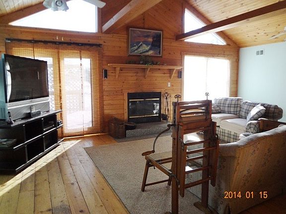 Unique, 1 acre property on edge of town overlooking the countryside! Home has a wonderful rustic cabin feel with vaulted ceilings, beams & tounge & groove exterior walls & ceilings! 5 sets of French doors to the outdoors! Beautiful wood burning FP surrounded by windows. Kitchen w/white cabinets, all appliances & dining area. Master suite w/large bath. 1st flr laundry, full part. fin basement & 2.5 car gar w/shop~WOW!