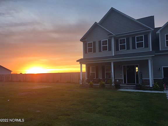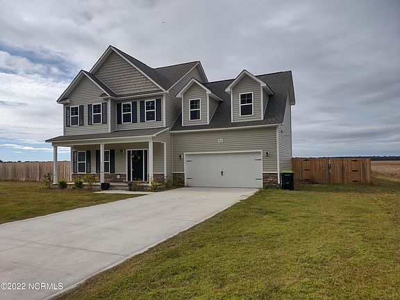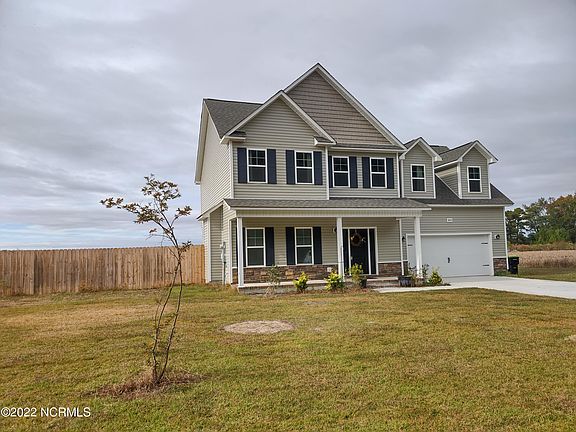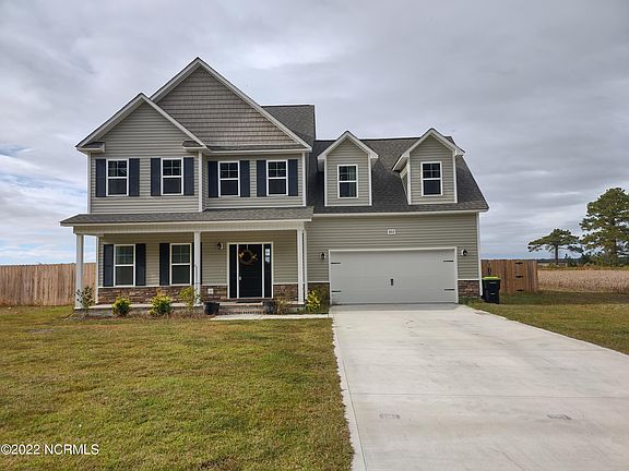 Newly built home in 2022 located in Richlands, NC the heart of country living. No city taxes. A community convenient to Camp Lejeune and MCAS New River Air Station. The front of the house features stonework, two-toned siding, board and batten and decorative shakes. Welcome guests onto a covered front porch ready for holiday decorating. The front porch is finished with an edging of brick for a custom look. The Charleston floor plan offers a generous foyer approximately 15'x6 with coat closet welcomes you into living room and kitchen. Gather in the living room boasting plenty of light and electric fireplace on cool evenings or enjoy the breeze with the ceiling fan on warm summer days. Roomy dining room is ready for gatherings featuring a tray ceiling, chair railing and lovely chandelier. The dining room is adjacent to a generous sized kitchen with work island, stainless steel appliances, and deep rich toned cabinets - the large kitchen is the heart of the home. Off the kitchen is pantry, utility/coat closet and half bathroom leading into the 2 car garage. Upstairs are three bedrooms, large bonus room with closet and laundry room. Master bedroom features trey ceiling with ceiling fan and two walk in closets for your wardrobe(s). Ensuite master bathroom with double sinks, soaking tub and separate shower. Two bedrooms and large bonus room share a full bath with dual vanity sink sure to make getting ready in the morning easier. At the end of the day park your vehicles or toys in the two car garage, the carriage style garage doors certainly add curb appeal. The house sets on a deep lot of approximately 1.5 acres with a large portion of the back yard enclosed with privacy fencing. Sit outside on your back patio to watch the clouds drift by, take in an evening sunset or barbeque with friends and family. This country setting is sure to please and is ready for you to move in and call it Home Sweet Home