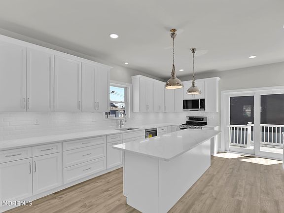Modern Chic Shore Colonial w/open floor plan- 3 bedrooms & 2.5 baths. Huge Eat-in Kitchen overlooks luxury vinyl floored Family Room! Gourmet Kitchen features quartz counter tops, SS appliances & soft close white underlit wooden cabinetry! Pantry is lighted & will hold all your Costco items. Massive 96'' island. Walled off area off of kitchen makes perfect homework/house command center. 1st floor Trex deck off Kitchen provides perfect entertainment flow for BarBQs! Spacious 2nd floor hallway! Lovely Primary Bedroom Suite w/Walk-in Closet, double sink vanity & custom tile shower. 2 other bedrooms serviced by full bath. Tankless Hot Water Heater! 8' Garage Doors w/lights & automatic openers hold full-sized SUV or Pickup Truck. Oversized, cement driveway allows 2 cars to be parked off street