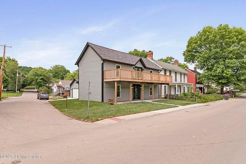 COMPLETELY RENOVATED! Everything is new, including heat/air, water heater, electric, plumbing, siding and roof. Home was lifted from railroad ties and new foundation was installed. Basically a new home. Inside is all new flooring and paint. Large living room leads to kitchen/dining area with all new fixtures, lighting, quartz counter tops new cabinet and access to rear of home.. Half bath off kitchen is also the laundry room with built-in cabinets. First floor primary suite features a private bath and walk-in closets. Two large bedrooms upstairs with a full bath and balcony that runs the width of the home. Directly across the street from the Kentucky River, with marina about 1/2 mile away. Peaceful public park behind the home. Plus a detached garage.