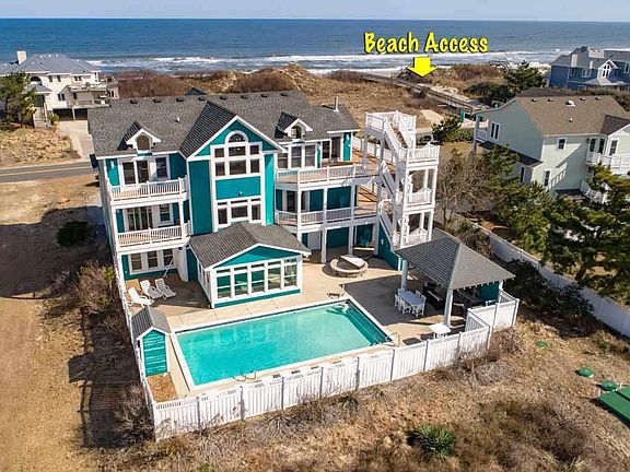 Live large in this custom-built 10 bedroom, 11.5-bath rental machine built for the discerning investor. It checks all the boxes- income, location, layout, views, and style. From the elegant curving staircase to the incredible ocean views, to the sauna and elevator, this property has it all- both inside and out. The open, reverse floor plan showcases the incredible views through an abundance of natural light, cathedral ceilings and spacious interior design. The kitchen is fit for a chef with a gas stovetop, 2 ovens & 2 dishwashers, granite counters with glass tile backsplash, furniture cabinetry, prep island with seating, and pantry. A river rock fireplace creates a focal point on chilly nights in the grand family room, flanked by two separate dining spaces. There is room for everybody! The upper level Master en suite offers ocean views, a custom shower, glass tiled double vanity, deep jet tub and a private balcony. All bedrooms have private tiled bathrooms and unique inlaid vanity tops to enhance the beach vacation feel. The elegance is continued on the ground level with a sauna, indoor pool, kitchenette with full size refrigerator and granite counters, billiard area and half bath. If that isn't enough, relax outside on the lanai while enjoying the gas stone fireplace and large outdoor pool, or private indoor pool. This property offers the elegance and grandeur found in few OBX properties, all while doing over $200K in gross rents last year. ($168K booked for 2019 already.) With attention to detail, custom touches, ocean views and one lot from the beach access, this splendid property is a must-see!