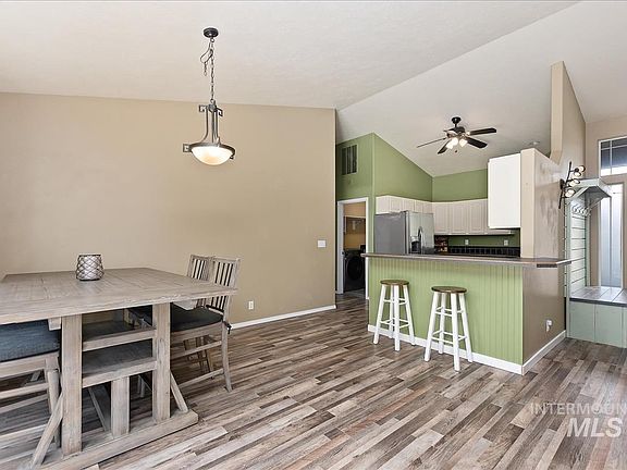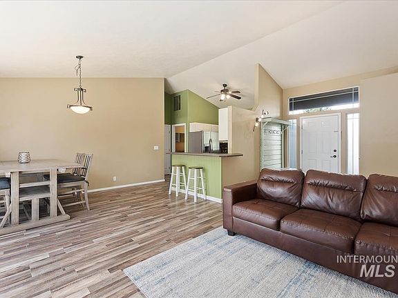 New Furnace & A/C, Water Heater, LVP flooring, Prof Painted Exterior/Baseboards/trim/doors. Newer Architectural Style Roof with Self Supporting Arch provides Vaulted Ceilings Throughout Entire Home! Steps from common area with Basketball & Tennis Courts & community walking paths all the way to Eagle's 'Prized' Geurber Park! Gorgeous Window-Wrapped Front Entry + Massive Windows looking to backyard + Open Concept Living Area + Tall Ceilings all contribute to Spacious Feel & Loads of natural light. Huge Bedrooms! Both 'splits' have built-in's & window seats, front room large enough to function as a Den/Bonus. Enormous Master suite with vaulted shelves for plenty of closet storage. Beautiful Newly-Tiled Shower. Tastefully updated & upgraded. Large back patio with Additional concrete pad from home to property line along N Side. Wired 4 Alarm & Surround Sound throughout interior & patio, finished garage. Architectural Style Roof Replaced in '13. Fridge, Washer/Dryer included with FP Offer