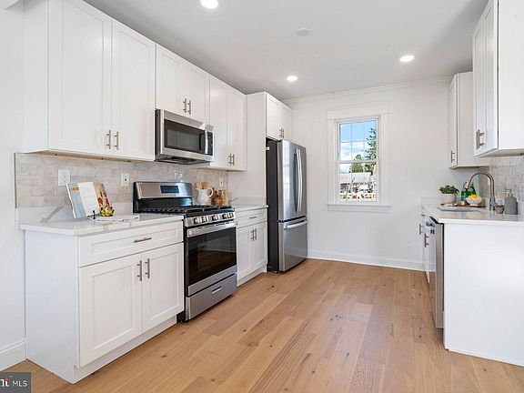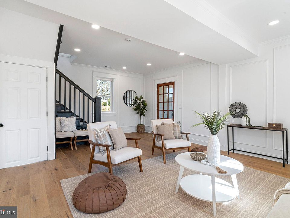 Welcome to 802 Houcksville, where historic charm meets modern detail. Parking is ample in the double-wide/extra-long driveway with access to the detached two-car garage. Make your way to the covered front entry into your new home and take in all the original character and modern updates. Just off the entry hall, behind a glass door is a bright spacious home office. As you step through into the open concept main living spaces, notice the stunning bold staircase leading to the second floor. You will find wide and picture frame moldings throughout the oversized living room, dining room with a beadboard ceiling, and a beautiful kitchen. The kitchen features plenty of shaker style cabinets, stainless steel appliances, sleek quartz countertops, and a beautifully tiled backsplash. Just beyond the kitchen is a mudroom , a half bath with a greenhouse window, and a large pantry/laundry room. The beautiful staircase leads to three similar sized bedrooms, a full bath with a shiplap wall and double sink vanity. There is a grand owners suite boasting a large walk-in closet, and a private bath featuring a beautifully tiled walk-in shower. From the main floor step outside to a large wood deck with a pergola roof that overlooks the tremendous yard filled with adult trees, tons of green space, storage shed, and so many possibilities. This home is move-in ready with so much to offer new homeowners including new flooring throughout, recessed lighting, and so much more. Imagine all this and in close proximity to shopping, restaurants, and commuter routes.