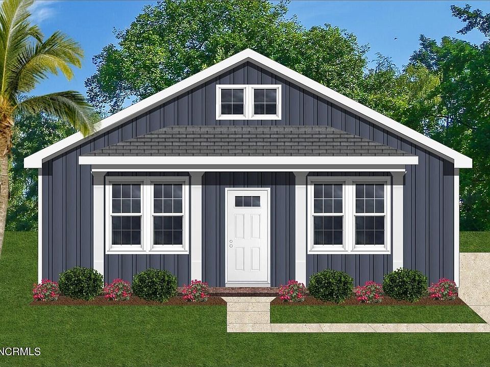 New Construction on Old Dow Road in Carolina Beach. The Sand Dollar plan is a one level home with 3 bedrooms, 2 full baths & 1,277 s.f. Covered front porch, open kitchen/dining/living area, master bedroom & bath, 2 guest bedrooms, laundry room & rear covered porch with a storage closet on the back of the house and an enclosed outdoor shower. Vinyl board and batten siding. Metal roof. Not in a flood zone. No HOA. Directly across the street from the Carolina Beach State Park.