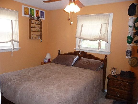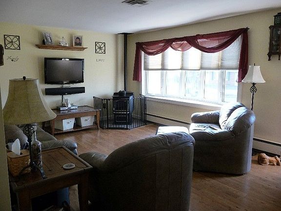 Nice 3-4 bedroom brick ranch on large level lot. Bright living room w/bay window, pergo floor, and pellet stove. Kitchen w/new appliances, and dining area opens to sunroom with propane heater. Finished lower level includes huge family room, great wet bar for entertaining, and office/4th bedroom with full bath. Wood deck w/roll-out awning overlooks lovely yard. 2 car garage w/work area.