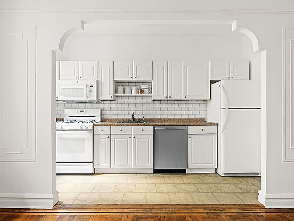 The king-sized bedroom feels private and sunny and is nearly the size of the living room with lots of space for dressers and a sitting area near the windows. The vintage bath with updated vanity and shower sits right outside the bedroom at the end of the hall. The spacious living room with decorative mantle can comfortably accommodate a large furniture grouping with room left over for bookcases, a game table or an additional conversation area. If you work from home, there is a perfect office nook just off the living room which could also function nicely as a gallery or library. Framed by an oversized shoulder arch, the kitchen is bright and airy with a new dishwasher and subway tile backsplash. Adjacent to the kitchen is a proper dining room with all the same beautiful pre-war details.