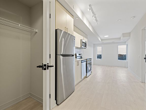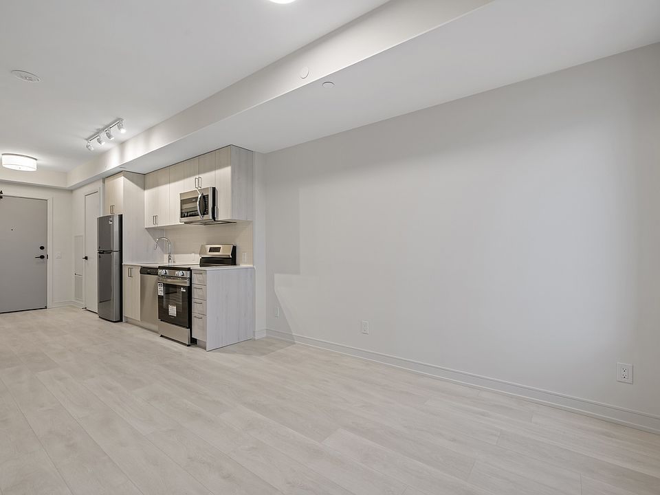Sun-drenched condo with light wood-look plank flooring and soft neutral finishes that expand the visual space. Full-length mirrored closet doors and modern matte-black hardware create a clean, contemporary feel while flush lighting highlights the open layout and effortless flow. Located in a vibrant community with thoughtful shared spaces that enhance everyday living.