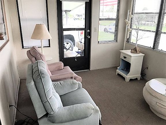 JUST LISTED - $14,000 This home features: 1. Very well-maintained home TURNKEY and Move-In ready. Unpack an go to the beach 2. Vaulted ceilings give an open airy feeling 3. Pretty glass front cabinets to store your kitchenware, and has a desk space for recipes and planning your entertaining 4. Front lanai has vinyl drop windows to give you a year-round room 5. The side lanai has vertical sliders to make it a year-round room also 6. Rear patio for grilling and relaxing 7. Newer tub and shower in both baths 8. Large master bedroom has two walk-in closets and plenty of room for a king bed 9. Large changing and master bathroom 10. Great location near Harmony Pool & Hall and most events 11. Near Sunset Pool and the Northside Fitness Room ACT FAST & CALL TODAY!! Don't forget to ask about the FINANCING available on this home. Colony Cove is an age qualified (55+) five-star resort community of manufactured / mobile homes. The "Cove" boasts 5 clubhouses, 5 heated pools, a riverfront pavilion and private fishing pier, a private marina, a fenced dog park (very pet friendly), tennis, shuffleboard, new pickleball courts, 2 new fitness rooms, 24 hour patrol, clubs for every interest, and much more. There are daily planned activities throughout the park. Bottom line, if you get bored here, it's your own fault!! The lot rent in Colony Cove is based on the homes' location. While the monthly rent may not be the lowest around, it's by far the best value for the money. Not only does the monthly rent cover all of the amenities of the community listed above, it also covers almost all other monthly expenses such as; water, sewer, trash pickup, all property taxes, lawn maintenance. . .pretty much every monthly expense except electricity and internet. The current lot rent on this home is estimated at $868 per month.