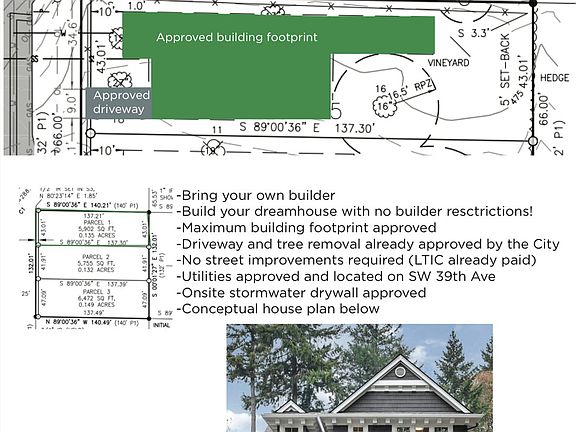Bring your own builder. Build your dream-house with no builder restrictions. Maximum Building Footprint Approved. Driveway and tree removal already approved by the city. No street improvements required LTIC already paid. Utilities approved and located on SW 39th. Onsite storm-water drywall approved. Conceptual house plan provided.