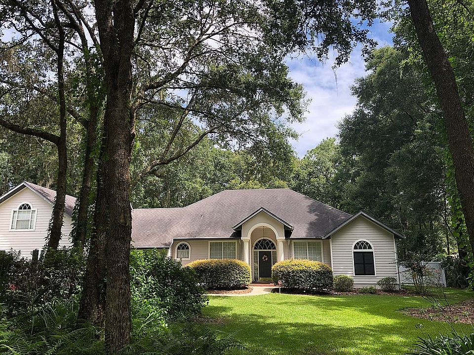 This stunning custom-built home has been admired by all who have graced its grounds over the years. 8020 SW 8th Ave is a beautiful, move in ready home, that with its bright and freshly painted neutral colors is ready to welcome you in as soon as you walk up the drive. The roof is new as of 2022 and has a transferable wind rating certificate to the new owner. This roof meets the latest Code requirements for significant Home Owners Insurance discounts. This home is nestled on 1.01 acres with mature landscaping and extra parking pad, in a highly desirable location in north central Gainesville, that is minutes to I-75, North Florida Regional, UF Health, the VA, University of Florida and shopping at the newly built Butler Plaza and Celebration Pointe. Gainesville is the ideal location in Florida, allowing you quick access to nearly all of the major cities and beaches in 2 hours or less. At 3,115 sqft of heated/AC space and 4,363 sqft total finished area under roof, this home is every bit of capacious. An open floor plan features a gourmet kitchen with an expansive island, gas stove top (ideal for hurricane season) and a spacious walk-in pantry, opening up to a sizable family room with vaulted cathedral 14’ ceiling, exposed beams, stacked stone gas fireplace with extensive built in bookcases, this home is wonderfully well-appointed. There is a separate formal living room, dining room, as well as a library which can be used as a home office. Beautiful oak hard woods, tile, 10-foot ceilings, and extensive use of crown molding span much of the main living areas. With 4 bedrooms and 3 full baths located in 3 distinct wings, privacy is abundant. The master suite is located on the main level and features spa like features with a custom shower and soaker tub with jacuzzi and not one, but two walk-in closets for all of your clothing needs. The guest suite also functions as a handicap accessible bathroom with taller toilets. The upstairs bonus room (442 sq ft) with open deck functions as a flex space which is currently being used as an extra bedroom for a college aged student. This space would also be great as a workout room, office, or second family room for the kids to play. With large closets in every room and a significant attic, storage is abundant. Throughout the house, you will find built-in-speakers with individual room volume control, perfect for entertaining. The three-car over-sized attached garaged has ample room for parking that will even accommodate SUV’s in addition to your lawnmower and yard equipment. It even has a ramp into the house, making the house wheelchair accessible! Off the main living areas, you will find access to 375 sq ft screened in lanai/cabana, with brand new outdoor fans, that opens to the beautiful pool oasis. Once outside, the PVC fenced backyard offers plenty of privacy and features a heated 25,000-gallon, 7 ½ foot deep, saltwater pool with a water slide and hot tub and energy efficient pump. The pool lanai offers 1,984 sq foot of enclosed vaulted patio that is perfect for outdoor entertaining year-round. The backyard is completed by a 16’ gate off the fence that allows access to a 24’x36’ pole barn with 110 volt electric that fits either boats or RVs. A fish cleaning station is provided with hot water service that is perfect for the outdoorsman. The extensive list of upgrades to the home include LED lights throughout the house, complete exterior hardiboard siding, complete irrigation system, security system, remote control lighting for security lighting in 5 zones. There are two distinct ac units for up and downstairs zones, both of which have been replaced recently with the larger unit having a SEER rating of 19. The home also features 2 water heaters located at each end of the house. With no HOA fees, more land and the significant attention to detail, this home is a must see! ** All kitchen appliances will remain in the home, W/D are up for negotiation with the buyer.