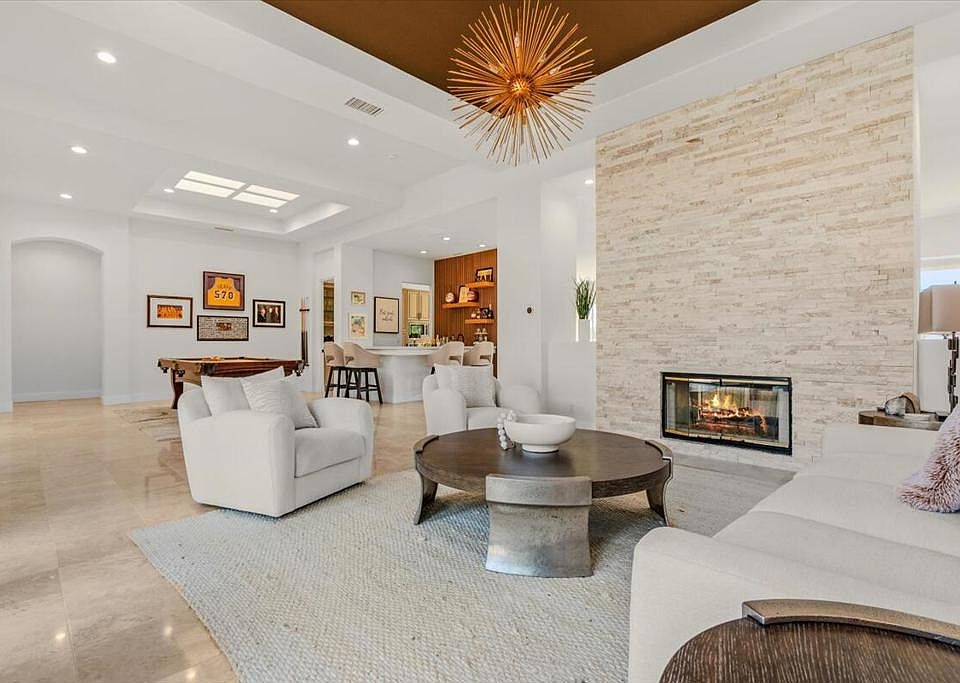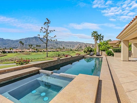 Incredible PGA West Signature mountain views from this amazing remodeled Heritage 3 floor plan with casita. Polished travertine floors, stacked stone fireplace, updated kitchen with custom Quartz countertops and backsplash with open floating shelves. Serve your guests a cocktail at the custom bar with fridge and ice maker while they have a robust game of pool! Temperature controlled wine storage. New carpet, new baseboards, freshly painted. Step into the primary suite with remodeled spa like bath. Automatic blinds open up to reveal the stunning view. 3 more ensuite bedrooms complete the home. Offered partially designer furnished. HOA includes internet, cable, roof, painting, landscape, security, trash, earthquake insurance and outside painting.