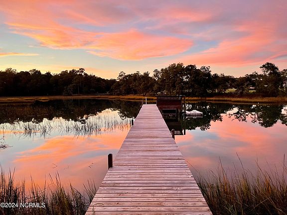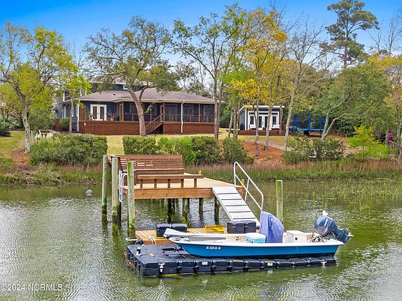 Whether you are water enthusiast or wildlife aficionado, you will feel like you're on a permanent vacation in this spectacular creek front home. This stunning 3100 sq ft home with 200 sq foot detached accessory building is nestled on a creek front bluff with over an acre of land. This spectacular home offers a serene and personal dock for boating, fishing, and taking in the beauty that surrounds you. Located on the highly coveted Bald Eagle Lane, just around the corner from Eagle Point Golf Club, with views of #9 & 10 greens, this boho-chic home features a functional and open design. Relax in the spacious living room that is both cozy and functional while opening up to picturesque Little Creek that looks out to the ICWW. The gourmet chef's kitchen offers an oversized island and stainless-steel appliances. The primary suite on the main level, welcomes you with a spa-style bath, 2 closets, and a private access to the back deck, with stunning views for immersing yourself in nature. Upstairs you will find spacious bedrooms and 2 additional baths as well as an additional living room or an office/gym, whatever your needs may be. Special features include interior home office, accessory building office, and 2 additional bonus rooms/space. The screened creek front porch with ample entertaining space gives you the perfect vantage point to overlook your resort /back yard paradise. Attention to detail and materials throughout. Truly take in the beauty of the water from sunrise to sunset! Conveniently located less than 2 miles from Porters Neck shopping area and restaurants, 8 miles to Mayfaire and 11 miles Wrightsville Beach. Start living your best Salt life today.