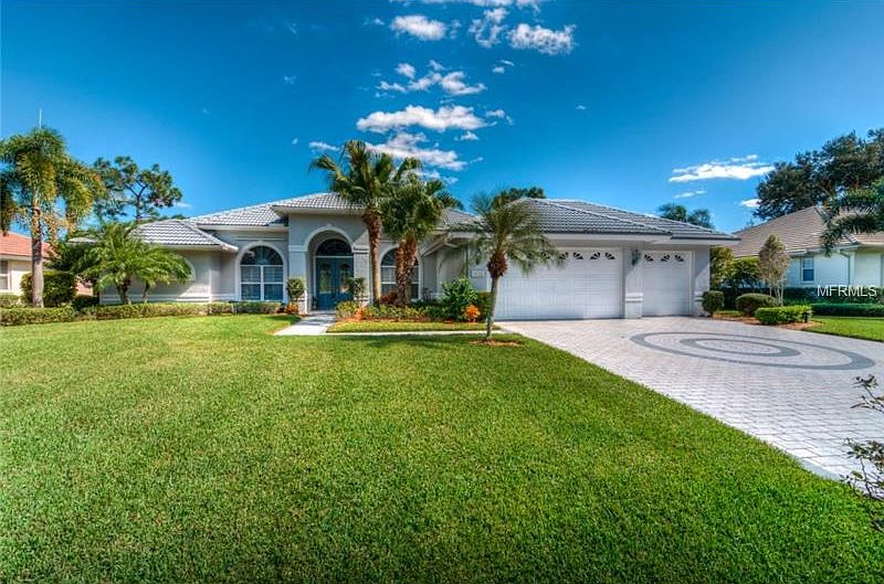 Lovely golf course pool home in the sought after private gated University Park community with 24 hour manned access control. Enjoy breathtaking sunrises from the screened lanai overlooking the private pool and spa perfectly situated on one of the best golf course lots in the neighborhood. This open split bedroom floor plan is perfect for entertaining and family gatherings. The kitchen boasts rich cherry cabinetry, under cabinet lighting solid surface counters, breakfast bar and skylight. The bright and airy office/den has French doors that open to the great room with volume ceilings, built ins and clerestory windows. You will love the luxurious master bath with raised soaking tub, granite countertops, dual sinks and large Roman shower. House guests can enjoy privacy from one of the two comfortable guest bedroom suites. This home also offers a spacious indoor utility room with sink, cabinets and convenient countertop surface area. There are loads of upgrades including crown molding, plantation shutters, surround sound, security system, central vac, hurricane shutters and plentiful storage throughout including a true three car garage. Mature landscaping adds even more beauty to this must see home. Social membership is required with ownership. Don't miss this fabulous opportunity located near shopping and restaurants including the new mall at University Town Center. Schedule your showing today!