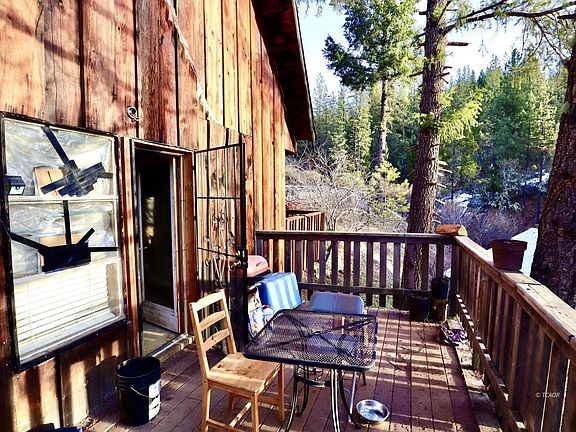 This beautiful 3-story, natural wood clad chalet is perched on 7.65ac overlooking Rattlesnake Creek. Once a confident and fruitful white market canna-production site, this property has all the things needed to resurrect that business or a proper homestead. The property is in need of some cleanup and TLC, but once finished will be a comfortable and picturesque mountain retreat. As one enters the gate, you're beckoned to the bridge over babbling waters and on up to the garage unit. This building is sound and sturdy, ready for a workshop, guest studio or garage. The '80s home has a fully built basement/ground level studio - just remove the plastic blackout curtains and let the light in. Upstairs you find the main level, entering into the open-concept kitchen/living room that looks out to a Westward facing balcony. Looking down the Rattlesnake Creek canyon from the deck gives perfect sunset views. There's a generous bathroom and large upstairs suite also waiting for your personal touches. Fully functional solar system power, large flattened garden areas, several thousand gallons of water storage, and a productive creekside well make this the complete package. Schedule a tour today.