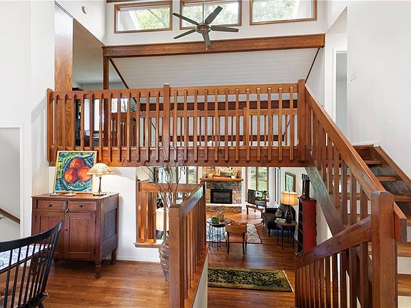 Soaring vaulted ceilings and an open staircase create an airy, expansive feel throughout. A dramatic catwalk leads to a private loft-like retreat nestled among the treetops, along with two additional bedrooms and a full bath—perfect for family or guests.