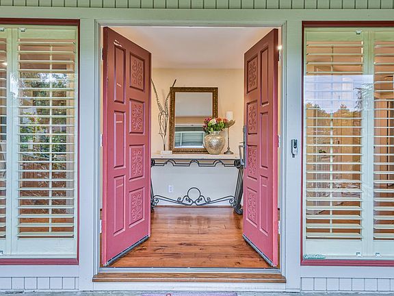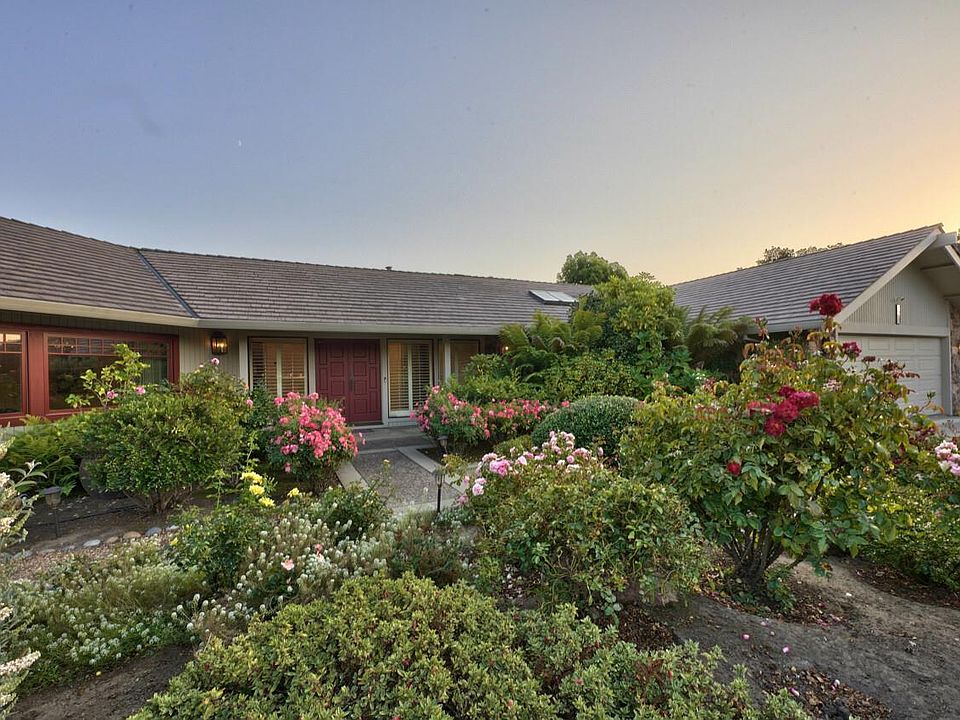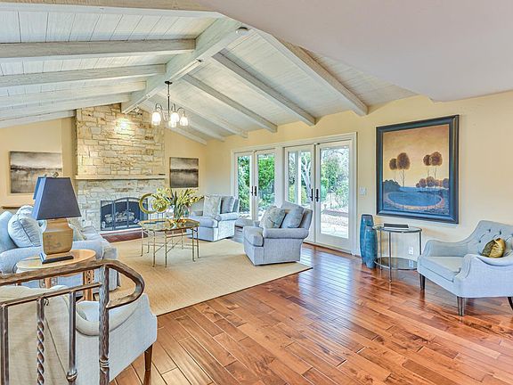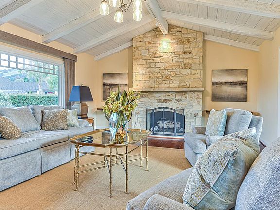 Fall in love with this enchanting home, ideally situated just steps away from Quail Lodge Golf Course. Boasting a south-facing orientation, the residence offers breathtaking mountain views and is nestled on a private cul-de-sac. This single-level home comprises three bedrooms and two bathrooms, featuring vaulted ceilings and glass doors that invite an abundance of natural light, creating a warm and inviting atmosphere. The chef's kitchen has been thoughtfully updated with Viking appliances and showcases charming white cupboards adorned with lighting. Each bedroom in the home offers a glass door opening to a private patio, providing a seamless connection between indoor and outdoor living. Elegant hardwood floors grace the entirety of the home, adding a touch of sophistication to the interior.
