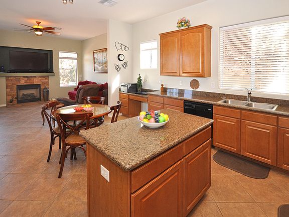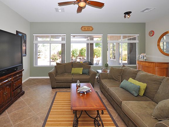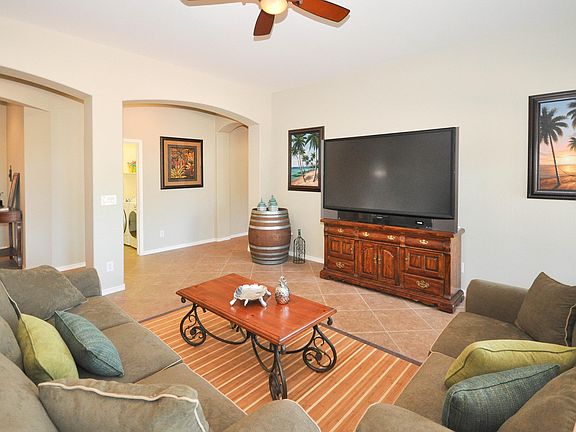 Everyone's favorite Pronghorn Ranch floor plan with extras galore! Lovely curb appeal & front landscaping is just the start. Welcoming foyer with 18'' diagonal tile extends throughout the spacious living room which features 10' ceilings & windows overlooking the lush backyard. The large, open kitchen, with adjacent great room, features upgraded 42'' cabinetry with island and granite counters plus eat in kitchen area and walk-in pantry. Impressive fireplace and cover patio access are just a few stunning great room features. Oversized master bedroom has master bath with double sinks, garden tub, separate shower and walk-in closets. Guest bedrooms and bath offer plenty of family space. Clubhouse, 2 pools, exercise room, basketball, tennis, and much more make this the place to live!