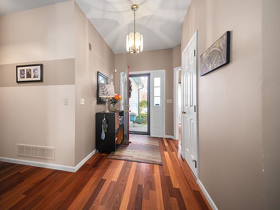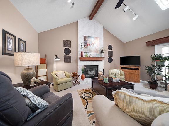 This beautifully maintained home offers charming details inside and out. The great room boasts a stunning gas fireplace with an exposed brick chimney and a vaulted ceiling, creating a warm and inviting atmosphere. The kitchen, with its elegant trayed ceiling, features all appliances staying, making it move-in ready. Enjoy the Brazilian Teak hardwood, ceramic tile flooring and carpet throughout. The master ensuite provides a retreat, while the serene backyard with a private patio is perfect for relaxing or entertaining. Updates include a newer roof and skylight installed by Windows Doors and More, Anderson windows, six-panel interior doors, and a 200-amp electrical panel. A whole-house humidifier, newer lighting and ceiling fan fixtures plus lawn irrigation system complete this home’s thoughtful features.