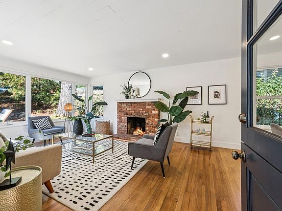 Enjoy the beautiful East Bay hills as a backdrop to your life in this stylishly upgraded 2+BD/1BA bungalow with two separate casitas steps from the King Estate Open Space. Privately surrounded by mature trees, the 1310 SQFT home welcomes you with a charming Dutch door and front yard seating area. Step into the sunny living room where you can relax with a fireplace and garden view. A clapboard ceiling and beautiful hardwood floors span into the dining room, and the upgraded eat-in kitchen features new appliances and recessed lighting. Through a convenient laundry area, there’s another Dutch door onto a deck for wonderful indoor/outdoor living. Dine al fresco overlooking the spacious backyard, entertain friends on the large front patio, or play in the garden. A recently built casita is perfect as an office or workshop, while the freestanding converted garage makes for another great space to work or unwind. Back inside two sunny bedrooms share a full bath. One bedroom includes a cedar-lined closet and clapboard walls, while one is slightly larger with backyard views. Parking is easy with a parking pad and long driveway. Out the front door, take your dog to the open space park down the street and admire the panoramic views, or visit the zoo and the multiple regional parks nearby.
