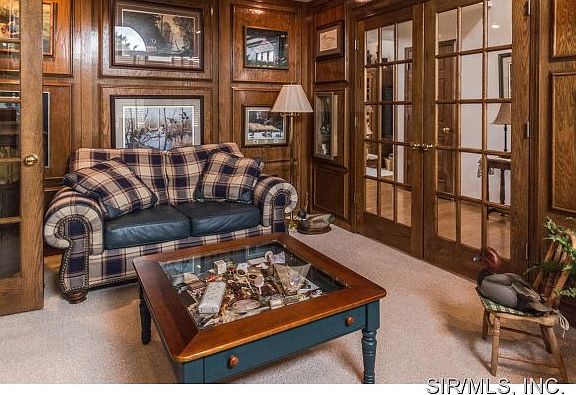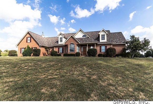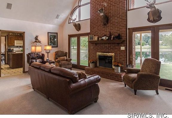 Welcome home to this picturesque 1 1/2 Story home on a park-like lake lot located just outside of Waterloo! This full brick home features quality finishes throughout and panoramic lake views from many of the room. Enjoy stunning lake views from the large living room w/soaring vaulted ceilings, floor to ceiling brick fireplace, doors leading to covered patio & open spindle stair leading to upper level. Eat-in kitchen offers ceramic tile floor, breakfast nook, & doors leading to the enormous covered patio. Main floor master suite offers attached luxury bath w/separate shower & soaking tub. Main floor office is sure to please with warm wood paneling finishes & French doors leading to the entry hall! Lower level boasts a wet bar, family room, 12 x 24 private security vault, bedroom with attached bath, plus a game room! This impeccably maintained home features a side entry 3 car garage, extensive landscaping, central vac, water softener, 2 furnace systems, and an architectural roof.