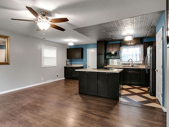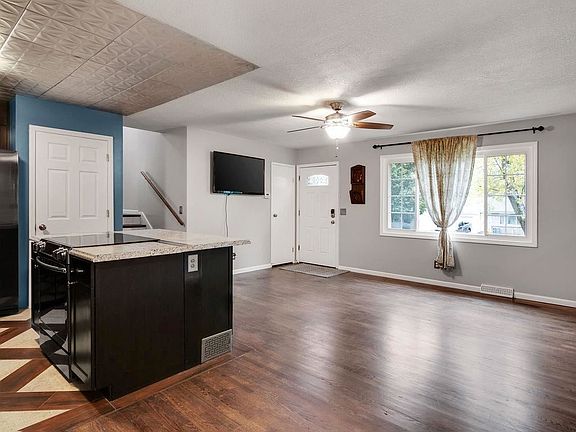 Open floor plan with Updates throughout. Dark hardwoods flow through the main floor, hallway & bedrooms. Dining room with built in buffet for additional counter space or coffee station. Kitchen has dark SS appliances, kitchen island with additional seating & detailed flooring. Bedrooms on 2nd floor with full bathroom. Family room has separate entrance to outside, additional storage & full bathroom. Vinyl windows, maintenance free siding & gutter guards for fall leaves. Furnace/AC less than 5 years. Simply move in!