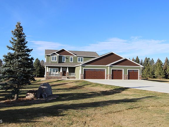 2014 Parade Of Homes BONUS Home! An original design,1 owner home featuring over 5,000 SqFt with an indoor BASKETBALL COURT. Located SE Rural Bismack among an oasis of mature trees and an abundance of nature to enjoy on 1.85 Acres. If you enjoy the finer things in life and want your home to reflect that, this extravagant Craftsman style two story masterpiece is for you. From stunning cherry custom woodwork throughout the house, custom lighting, pella windows and doors, GEO Thermal System, Radiant floor heat, 2 Fireplaces, Custom Bar Area, Theater Room, Exercise Room, Security and Video System, 1660 Sq Ft 4 Stall Garage with massive storage and a one of a kind Designer Kitchen with Butler Pantry, the list goes on and on. The main floor was designed for beauty and privacy (no bedrooms). You will love the custom gourmet kitchen to bring out the chef in you. Offering 2 unique work spaces, a large island with stunning peacock granite, butler pantry, double steam oven, induction cooktop, prep sink, wine fridge & more. Since family and guests seem to gravitate close to the kitchen area this is a great entertaining floor as your guests can enjoy two living rooms both with fireplaces, watch TV, walk out on your supersized covered deck and enjoy the gorgeous backyard. If you work from home there is a beautiful executive office with wainscoted walls, large enough to house all your office needs a mail/coat locker area & bath right off the garage entrance. If you need more room for entertaining head downstairs to your Basketball Court, Exercise Room with Sauna, Theater Room with 120'' Screen with Full Custom Bar area. You will also find a large Bedroom with walk in closet and pocket door to a beautiful Bathroom. After the day is all done and you're ready to rest up, head upstairs to the top level to your private living quarters. Curl up in the loft to enjoy a good book or relax with some TV, the view is wonderful. The primary luxury bedroom is free from chests and dressers as there is a custom walk in closet that is fabulous with built in drawers and shelfs. You will also have a private vanity area to sit and beautify yourself! The bathroom has double sinks, gorgeous granite countertops, custom 2 person steam shower, linen closet and heated floor. The best part is the peaceful view you will wake up to every morning overlooking the tree tops! There are 2 more large bedrooms with walk-in closets both at the end of the hall with sharable bathroom. This full bath has double sinks, gorgeous granite counters, private bathing/toilet area and heated floor. The Laundry room is in between the bedrooms with built in elevation for washer and dryer, clothes hanging area, lots of cupboard space for linens and fun colors! But wait there's more! You will find a secret FULL sized walk in attic off the spare bedroom for even more storage...absolutely genius!! Now for the garage area! Once again designed fabulously to have the 4th stall walled off privately to store your mower, yard tools, etc. The 3 stalls can remain clean and you have lots of cupboards and large granite countertop to utilize, sink area and don't forget about the massive storage room. All stalls have a heated floor to keep you toasty in the wintertime. The 1.85 Acres is nothing but stunning and a little peace of heaven, yet close to Bismarck and a private golf course. I promise you will never want to leave once you move in! Please feel free to call for a private showing, we only request you are bank approved before setting it up. Agent/Owner.