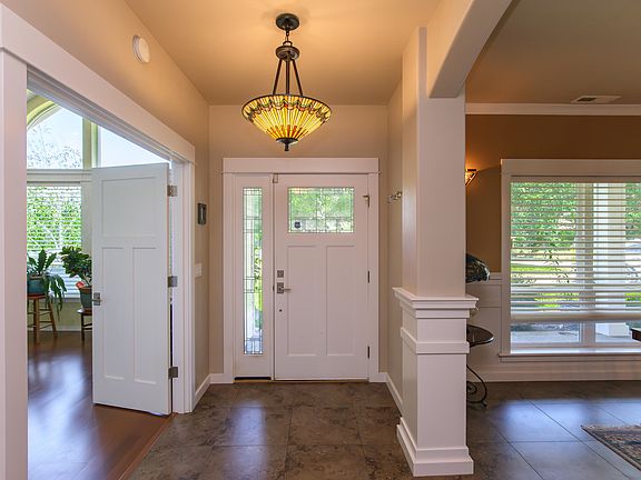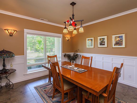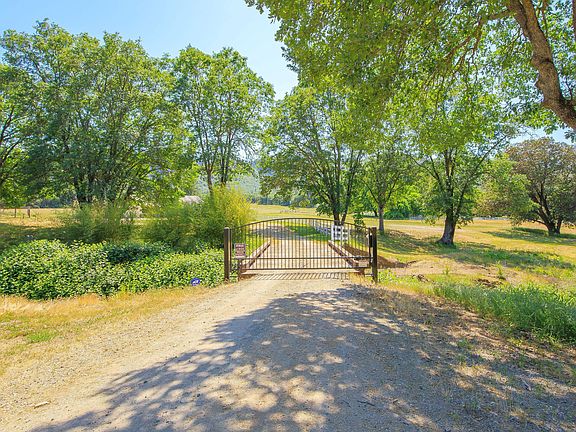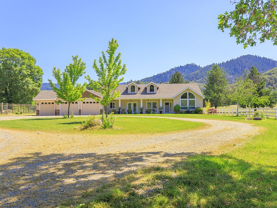 Amazing country home on 6.1 level acres. Wonderful open floor plan. Great Room with gas fireplace and vaulted ceiling. Dining Room with wainscoting and Tiffany light fixtures. Lovely kitchen with large island eating bar. Office with french doors to outside. Master Suite has coffered ceiling. Bath with large shower, double sink, jetted tub & walk-in closet. 3-car garage. Covered Porch. Detached 576 sq ft Shop/garage plus smaller detached shop. Kane Creek runs through property and has two bridges. Good well with 2,000 gallon hold tank. Must see this property to appreciate all it offers.
