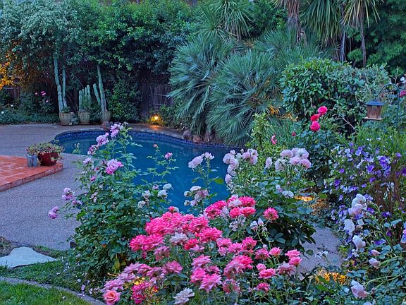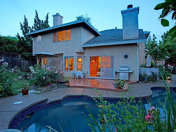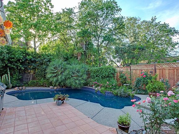 Tucked away at the end of a manicured cul-de-sac, this home has a park-like backyard filled w/ trees, shrubs & colorful flowers; outdoor dining by the pool joyful. The interior has a great layout, w/4 bedrooms & 3 baths, including a large master suite w/walk-in closet. There is a downstairs remote bedroom/bath. The family room opens to the kitchen & features vaulted ceilings, wood floors & brick fireplace w/ insert. NEW ROOF & HVAC in 2014!