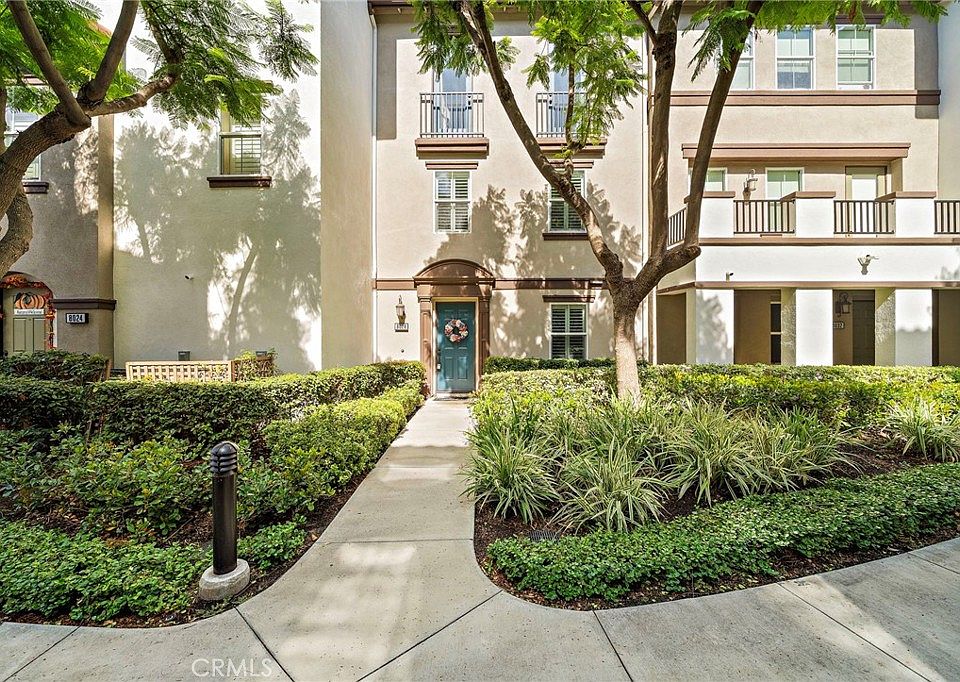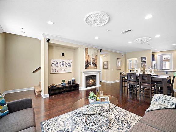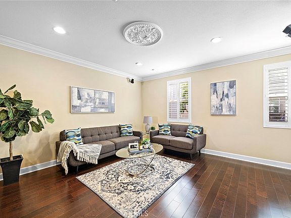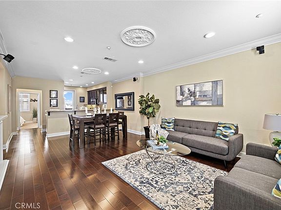 Absolutely stunning tri-level townhome-style condo quality-built by Taylor Woodrow in 2007, nestled in the exclusive Palazzo community within Renaissance Plaza with resort-style association pool, spa, and beautifully landscaped grounds, this contemporary beauty boasts 4 bedrooms, 4 full bathrooms, and 1,814 square feet and has been beautifully upgraded with modern luxury finishes throughout including central A/C, volume ceilings, crown molding, dual pane windows, plantation shutters, clear-glass French doors, raised panel interior doors and closet doors, LED recessed lighting, wide-plank wood laminate flooring, and full surround-sound wiring; the remodeled chef’s dream kitchen is a masterpiece with granite countertops, full granite backsplash, rich dark-wood soft-closing cabinetry with glass display panels and under-cabinet lighting, stainless double sinks, and stainless appliances including a gas range, dishwasher, and microwave, plus a breakfast bar open to the elegant living room with fireplace, media niche, and dining area, with a French door leading to a private second-level patio perfect for evening barbeques and dining; the bathrooms showcase Carrera marble-look countertops, upgraded lighting, tile finishes, and clear-glass enclosures, with dual sinks in the primary suite, while an ensuite bedroom on the first floor, inside laundry room, and direct-access 2-car garage plus an additional guest parking provide comfort and convenience; ideally located in the vibrant heart of Stanton, close to shopping, dining, parks, and schools with quick access to the 5, 22, and 91 freeways, offering the perfect combination of modern living, convenience, and effortless accessibility.