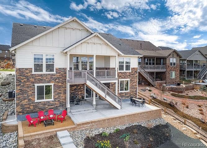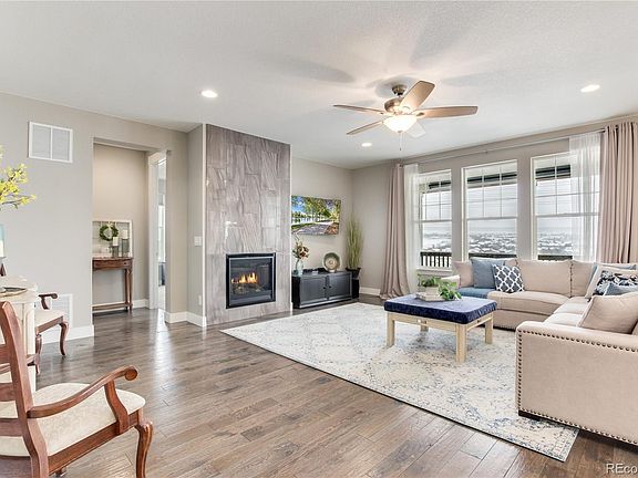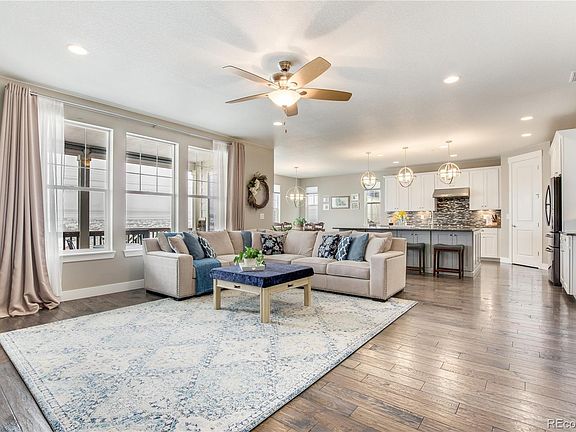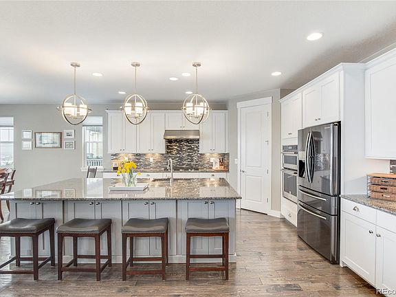 Unexpected and breathtakingly expansive mountain views and amazing sunsets from the privacy of your backyard overlooking multiple outdoor entertaining areas! Close proximity to miles of walking/biking trails and the newly built play structure/splash pad at Red-tailed Hawk Park. Striking hardwood floors and designer light fixtures enhance this spacious ranch home. The open concept and 9'ceilings, 8' doors throughout, make this home perfect for entertaining! Gourmet kitchen includes upgraded appliances, lovely two-toned white & gray 42" cabinets, large walk-in pantry, and a GRAND double island offering enhanced storage space. Relaxing master retreat featuring a private soaking tub and clear glass-enclosed shower, fit for a spa! Spacious walk-in closets in all bedrooms. Expansive 2403 sq. ft. walk-out basement. If home is where the heart is, this beauty is sure to capture yours!