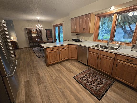 This quality built 2 bedroom twin home offers a great location and exceptional curb appeal! Interior features spacious kitchen with plentiful oak cabinets & countertops, dining bar & stainless steel appliances. Enjoy entertaining in this good sized dining room with patio door to east patio. Seller just installed attractive new vinyl plank flooring in kitchen, dining, laundry, bath, hallway & bedrooms. Large carpeted living room with southern windows, attractive front door, & coat closet. Hallway area leads to primary bedroom with double closets, bath with convenient walk in shower, & the guest bedroom. The utility/ laundry room is located off of the kitchen - (forced air gas furnace, water softener, gas water heater, electrical box, lift up door to crawl space (access to plumbing & sump pump). Garage is 24 x22 & faces south with cement driveway. If you are in the market for well kept single story twin home give us a call today!