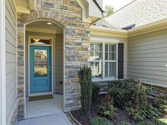 The most inviting home on the cul-de-sac! Beautiful landscaping and an adjacent private buffer create a unique setting for this home. The desirable ranch floorplan is accented by coffered and vaulted ceilings enhancing the dynamic flow between rooms. The large family room shares a double sided fireplace with the cheerful sunroom providing flexible living areas for entertaining or relaxing. Enjoy cooking in the adjacent kitchen with its huge island and convenient bar seating. Gas range, pantry, granite counters and tile backsplash are added enticements. A handy butlers pantry provides a useful transition to the spacious dining room. Retreat to the secluded primary suite and feel pampered by the oversized tile shower, granite counters and walk in closet. The front bedroom is ideally suited as an office and the third bedroom is well located near the secondary bath. Sunshine and breezes are welcome on the screened porch and patio while a little rain helps the pear, peach and persimmon trees grow. Come explore all this enchanting home has to offer!
