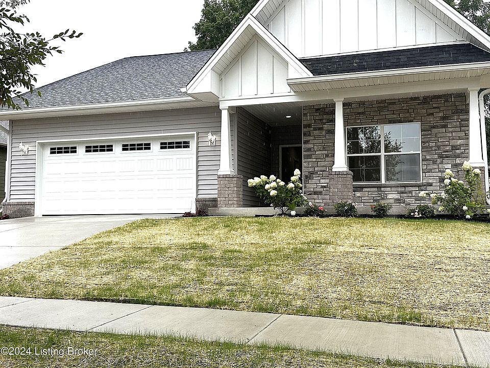 Ready To Move In! Introducing a stunning 3 bed, 2 bath Craftsman-style single story ranch, boasting 1490 sq ft of beautifully designed open living space. Built with meticulous attention to detail and enhanced with structural upgrades including metal beams and columns, this home offers unparalleled strength and durability. Enjoy the luxury of extra underlayment under LVP with padded flooring, Shaker style American Woodmark kitchen cabinets, and quartz countertops in both the kitchen and primary suite bath. The bathrooms feature elegant porcelain tiles, and the home o The home features a beautiful stone facade and a brick skirt, complemented by durable, thick vinyl siding and Hardie vertical board (Hardie Trim Batten Board) on the front gables. It is built on a slab foundation, ensuring stability and low maintenance. All utilities are electric, including an efficient electric heat pump and air handler for heating and cooling, electric water heater and electric range. The kitchen features beautiful stainless-steel appliances - range, microwave, dishwasher, garbage disposal, enhancing both style and functionality. Please note, the refrigerator is not provided by the seller.