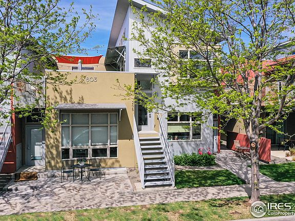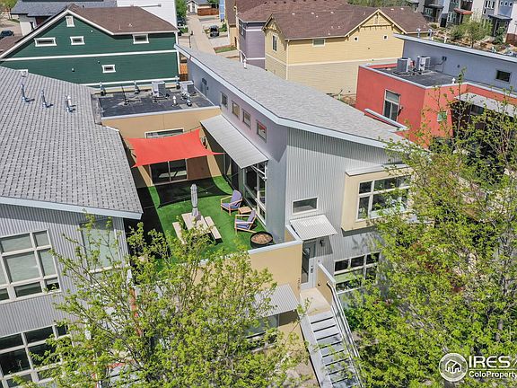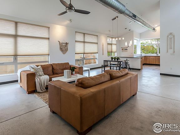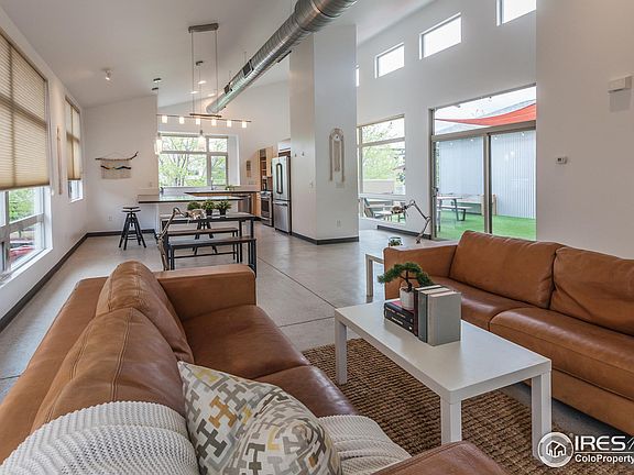 Old Town North top-floor & corner unit condo featuring an awesome beer garden / outdoor patio. Walk or bike to New Belgium, Old Town restaurants & stores, Poudre River Whitewater Park & Martinez Park. Designed by award-winning local architect Greg Fisher, boasting floor-to-ceiling windows on all sides, sky-high ceilings, & concrete floors throughout. The extra-large kitchen enjoys high-end stainless-steel appliances, a new Bosch dishwasher (2022), wrap-around breakfast bar, new countertops (2020), & modern cabinetry with soft-close draws. The large, open-concept dining/ living room with awesome exposed duct work fronts to the outdoor patio & includes a gas hookup for an optional living room fireplace. The primary bedroom has a walk-in closet & adjoining bathroom with double sinks & large walk-in shower. The second bedroom fits a queen bed, has foothills views, & attic entry for additional storage. Enjoy morning coffee & evening beverages on the fully turfed (2021) patio which includes a gas hookup for an outdoor fire pit. Picnic table, umbrella, cafe lights, three raised vegetable garden beds, annual Colorado wildflower garden bed, & large awning are included. Parking includes a private covered carport space & plentiful on-street parking for guests. HOA covers basic cable & internet, landscape maintenance, water, sewer, trash, & snow removal. Tankless hot water heater. Furnace installed 2017. Hunter Douglas blinds. Washer & dryer included. Click on Video/Virtual tour for full video.