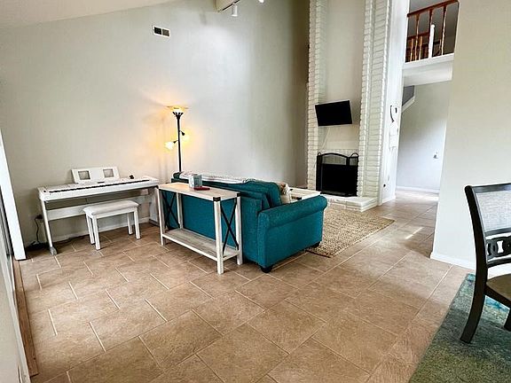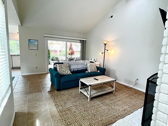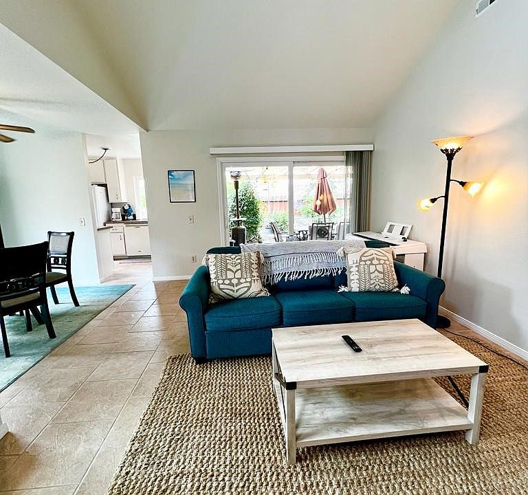This beautiful home is situated in the desirable Alta Mira Complex, just 1 mile from the beach! TWO BEDROOMS/TWO BATHS DOWNSTAIRS. Optional 3rd bedroom, office, media, or entertainment room upstairs. Large Main bedroom with spacious walk-in closet and patio door to the private lush backyard. Dramatic vaulted ceilings in the living room area with open plan dining and fireplace. Light and bright kitchen with garden view and direct side door to the patio. FULLY FURNISHED (negotiable) and includes a washer and dryer, grill, TVs, dining room table and chairs, living room furniture, 3 beds, dressers, plants, patio heater, and patio furniture. Ceiling fans in bedrooms and dining room. Lots of storage in the attic area and one car attached garage. Updated tile flooring, countertops, and fixtures. Newer double-paned windows. Beautifully landscaped grounds with roses, succulents, and palm trees. The neighborhood features walking trails, two community pools, a clubhouse, and a hot tub. HIGHLY RATED SCHOOLS. Close to beaches, dining, and restaurants! A must-see!!