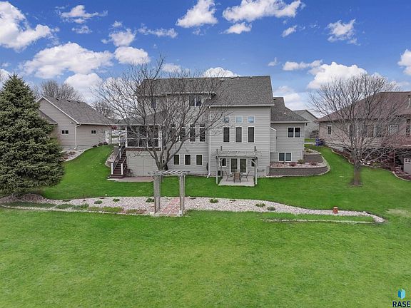 5 bed, 4 bath two-story home located directly on hole #7 of the Dell Rapids Rocky Run Golf Course. The perfect home for family life as well as entertaining, this home has an amazing floor plan. You will love the welcoming foyer leading into the living room with soaring ceilings, tall windows & gas fireplace. The kitchen features tons of cabinets and windows, a granite kitchen island and countertops, door to screened in deck that overlooks the golf course. Main floor laundry, ½ bath convenient to the kitchen & 3 stall heated garage. Primary suite has a walk-in closet, full bath with in-floor heat. Upstairs you will find a room overlooking the living room, 2 bedrooms w/ walk in closets, full bath w/ 2 sinks & a large storage room. Basement features newly updated family room w/ electric fireplace, walk-out door to patio & backyard, two bedrooms and 2 large storage rooms. Andersen Windows throughout, furnace/AC in 2022. Welcome home!