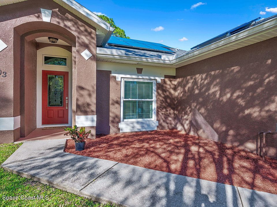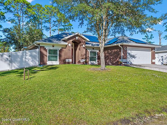 Solar Powered, Generac Generator, Hurricane Windows in this Move-In Ready Oasis in Palm Bay which is packed with updates & features! Solar is paid for and provides low bills and sometimes FPL checks. It offers energy efficiency & reliability. Hurricane-rated windows /door provide peace of mind, while a 2024 roof, updated a/c, garage door rails, ceiling fans, light fixtures & hot water heater make this home worry-free.The light, neutral interior colors & open layout create an inviting atmosphere.Designer features such as wood shelves in closets, Tile flooring in the main traffic areas & newer cushy carpet in the bedrooms plus updates in bathrooms make this home feel warm & inviting.The fully fenced backyard is perfect for outdoor living, featuring a pergola on a concrete pad, a separate lean-to for additional shade,& a 10x12 aluminum shed for all the toys.This home is both stylish & functional, with ample space for entertaining or relaxing.This one is loaded with extras