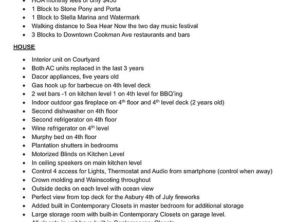 Located just 1 block from the beach and three blocks from the Cookman Ave downtown. This beautiful townhome located in the courtyard of The Vive boasts nearly 2300 square feet of multi level living with a 2 car garage and stunning ocean views from multiple levels of the unit! LOW HOA Fees of $450! The 12 x 19 Rooftop deck features a double sided gas FP, permanent pergola and gas BBQ. Enjoy annual festivities such as 4th of July fireworks right from your rooftop. Walk to Sea Hear Now! The famous nightlife of the Stone Pony, Porta and Wonder Bar are mere steps from your front door! Tons of upgrades: Wainscotting, crown mldg and HW floors throughout. Gourmet Kitchen featuring stainless Dacor appliances and quartz counters. Plantation shutters and motorized window treatments and much more!