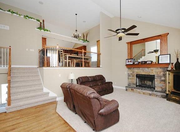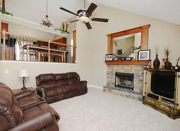 Custom built home on oversized lot! Stunning curb appeal and beautiful finishes inside. The great rm boasts a stone stone surround fireplace and has an open floor plan filled with natural light and vaulted ceilings. The kitchen has new granite counters and a spacious dining area. THREE large living areas in this home include the great room, lower level family room that opens to the patio and a huge rec/media room! Oversized garage to fit large trucks! Great location walking distance to schools, the pond and trails!