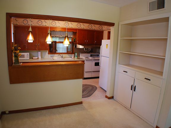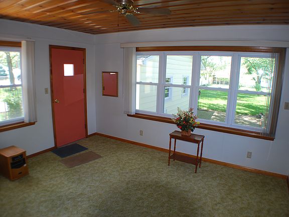 One owner well maintained home in move in condition featuring large living room open to dining area with built in china cabinet, open pass through to kitchen with lots of nice wooden cabinets plus stove and refrigerator staying. Two bedrooms and updated bathroom. You are sure to love the sun room with replacement windows allowing full view of pretty landscaped back lawn and electric portable heater stays. 1 1/2 car garage has nice storage and electric opener.