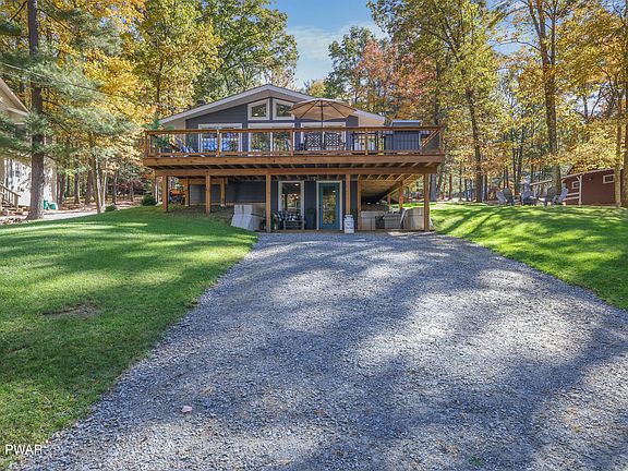 Completely remodeled Lake Wallenpaupack ranch, with upscale & modern finishes, this 3-bedroom, 2-bathroom home is a rare gem offering both luxury and comfort. Nestled just steps from the lake with a private association dock, gathering area and boat launch, the gorgeous open floor plan welcomes you into a bright and airy open floor plan kitchen/living/dining space, perfect for relaxing or entertaining. The heart of the home features beautiful lake views with expansive decks overlooking the water that total almost 1,000 square feet of additional entertaining space, making for memorable evening family dinners that extend into the night, and hot tub area with a dedicated electrical circuit. The main level features a spacious master suite with a sleek glass-front custom shower, his & her sinks, and thoughtful design touches throughout. Another incredible feature is the oversized 3-car garage with lighting, outlets, and powered garage door openers, that offers ample storage, as well as tons of parking for all the toys, and the dual driveways include plenty of parking for guests. A beautiful grassy front yard creates a perfect outdoor space for play or relaxation. With an on-demand hot water heater, high-efficiency 3-zone in-floor hydronic radiant, 1-zone baseboard hydronic radiant heating, and back up generator system, this home combines convenience with modern amenities. Located close to the town of Hawley with restaurants, grocery stores, banks, gas stations, the Wallenpaupack Area schools, and Interstate 84, this stunning retreat offers the best of both private lake life and convenient accessibility. Don't miss your chance to own this beautiful home with incredible charm and practicality in an unbeatable location! Ask your real estate professional for the full list of upgrades, virtual tour, floor plans, and more!