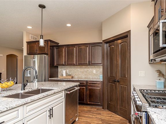 This beautiful well maintained ranch home has so much to offer! Large windows create a warm and welcoming gathering space. The open floor plan includes a family room with a fireplace, an open kitchen with a large island, ss appliances, a gas stove, under cabinet lighting, and soft close drawers. The HUGE walk-in hidden pantry has an extra freezer to make the evening meals a little smoother. Wait until you see the stunning walk-in tiled shower, dual vanities, WIC with a stackable washer and dryer in the master suite. The 2nd large bedroom has easy access to a full bathroom. The convenient lockers and drop zone as you enter from the garage offer a fabulous solution for the organization of those coats, shoes, and backpacks. The HUGE finished walk-out basement does not disappoint either! It includes a family room, an oversized bedroom, a full bath, a large rec room for entertaining/gaming & tons of storage. Outside the luxuries continue w/ a beautiful deck off the kitchen for grilling or a meal outside, and a covered patio off of the basement doors. A fully fenced yard complete w/irrigation ready for all your backyard festivities! ALL appliances stay, including the mini fridge in the basement and W&D! Quiet cul-de-sac & lovely neighborhood. The 2x6 construction, & passive radon mitigation, central vacuum, and Lifebreath air filtration system (in addition to normal, 4 HVAC filter, are just the beginning for this pristine well-built home!