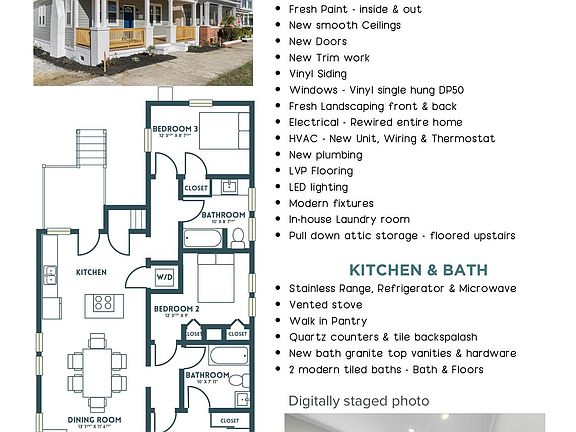 Inside, is a newly presented open floor plan. Now offering 3 bedrooms & 2 full bathrooms at 1178 HSF. Enjoy the peace of mind with upgraded electrical, a new HVAC unit & programmable thermostats & new water heater, new energy efficient vinyl DP50 windows, that make for an efficient home & lower energy bills. Cozy electric fireplace for added ambiance, low maintenance LVP flooring, and the bright spacious kitchen with all new stainless appliances, including microwave, quartz counters, and spacious pantry. And don't forget the cute back patio space, and the fresh landscaping front & back enhance the outdoor space. Practicalities include a laundry closet perfect for stackable washer/dryer & a pull-down stairs to attic storage with a full floored attic.